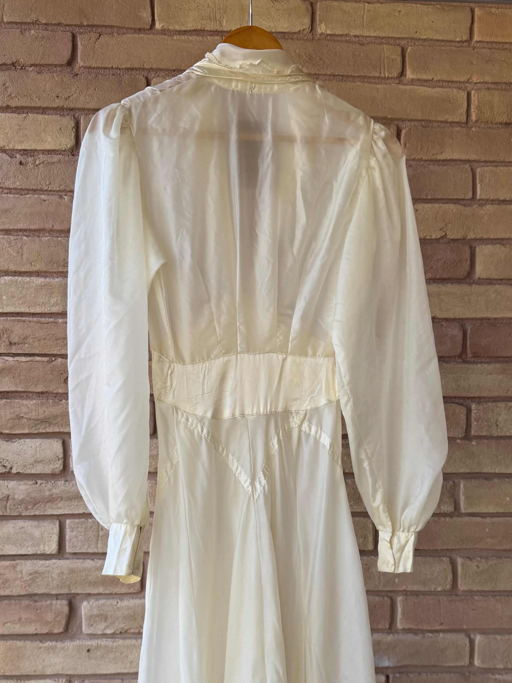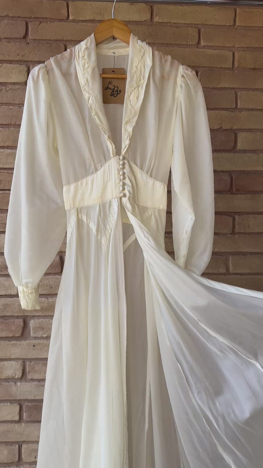 1940s soft nylon peignoir dressing robe with lace and satin trim. Covered button front closures