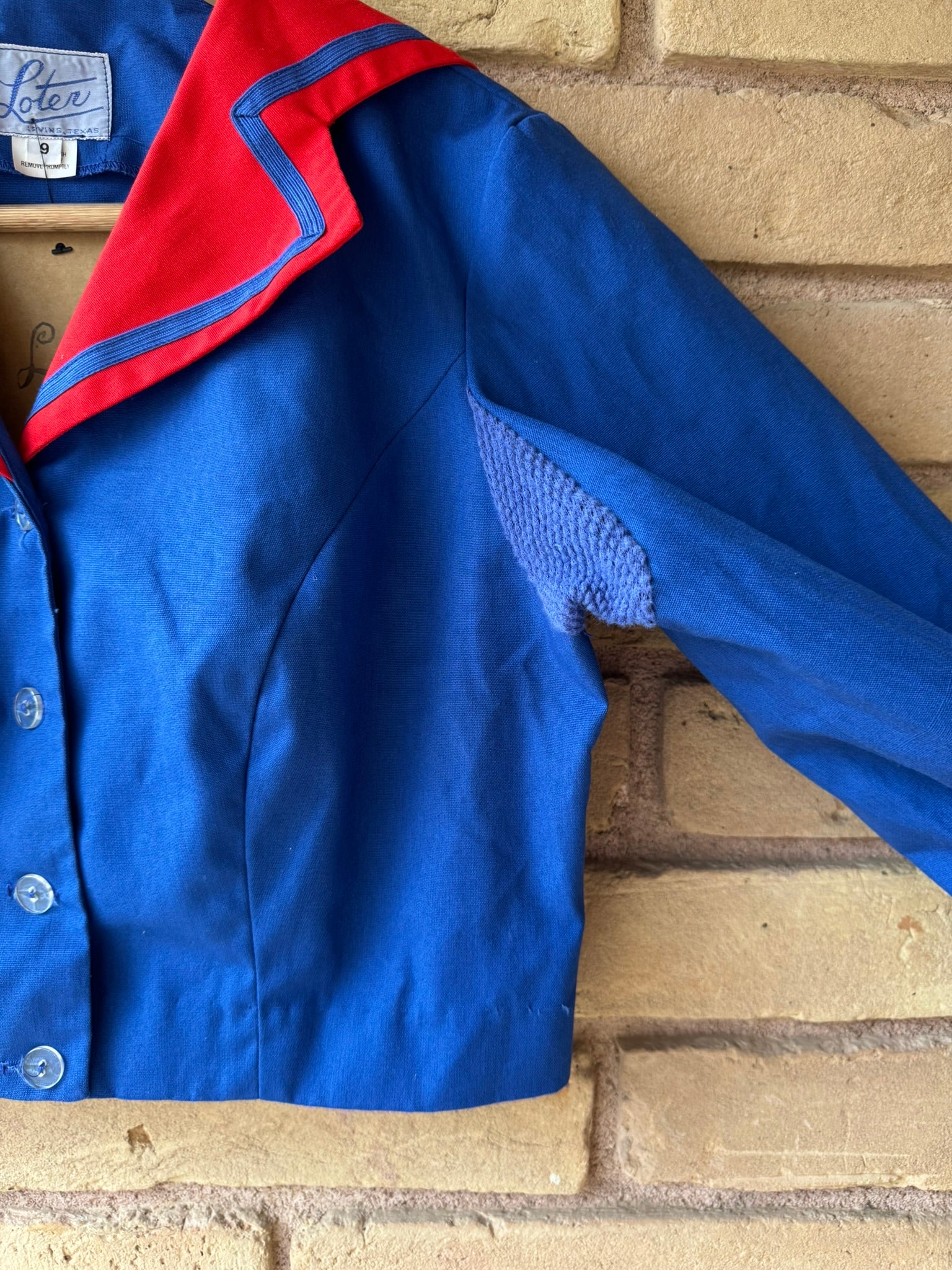 1980s blue and red cropped sailor top with knit armhole vents by Loten brand